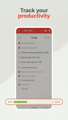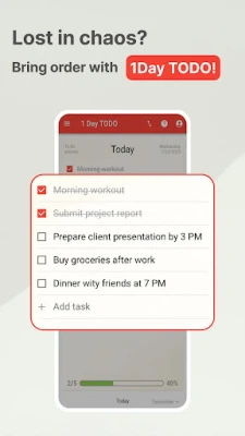Dengan 1 Day TODO: Daily Task Manager, anda boleh mencipta senarai tugas harian yang pintar dan dinamik. Tuliskan matlamat anda, tandakannya apabila selesai, dan jangan bimbang jika ada yang tertinggal; tugas yang belum selesai akan dipindahkan secara automatik ke hari berikutnya, memastikan anda sentiasa bermula hari dengan jelas tanpa kehilangan jejak. Selain itu, kebebasan untuk mencipta senarai semak tersuai tanpa had membolehkan anda merancang apa sahaja, daripada rutin pagi, senarai pembungkusan, hingga panggilan penting, semuanya disesuaikan dengan gaya hidup anda.
