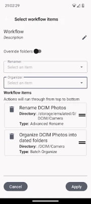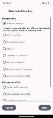 Hentikan penamaan semula satu persatu dengan ciri penggantian nama pukal yang intuitif. Ubah beribu-ribu fail dalam sekelip mata menggunakan format tersuai seperti cap masa, metadata, atau tambah awalan/akhiran dan penghitung. Urus fail anda dengan lebih cekap dengan membiarkan Rename and Organize Files menyusunnya secara automatik ke dalam folder berdasarkan kriteria pilihan anda. Tambah automasi ke folder anda: tetapkan peraturan untuk memantau folder dan lihat fail dinamakan semula atau dipindahkan sebaik sahaja ia disimpan. Untuk kecekapan maksimum, gabungkan preset-preset ini ke dalam aliran kerja yang berkuasa, jalankan tugas di latar belakang, malah jadualkan agar berfungsi pada waktu yang ditetapkan. Pindahkan fail dengan lancar antara storan dalaman, kad SD, dan storan rangkaian SMB, dengan penapis pintar memastikan hanya fail yang dikehendaki sahaja dipindahkan. Bahkan, ia boleh disepadukan dengan Tasker untuk automasi lebih mendalam.