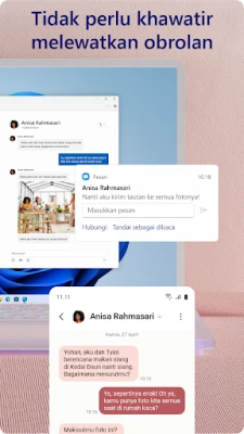 Bayangkan kebebasan menguruskan dunia digital anda tanpa perlu beralih antara peranti. Aplikasi Koneksi ke Ponsel berfungsi sebagai jambatan pintar yang menghubungkan telefon Android dan PC anda, mewujudkan pengalaman berterusan yang memaksimumkan produktiviti. Jawab panggilan penting, balas mesej teks, dan semak notifikasi terkini terus dari skrin besar PC anda, memastikan anda sentiasa berhubung dan fokus pada tugasan tanpa sebarang gangguan.